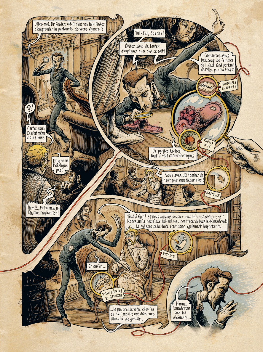 Plutôt que d’adapter un épisode existant, le choix a été de créer une histoire inédite. Si le contexte, les codes de l’original et le caractère des acteurs sont parfaitement respectés, les auteurs se sont amusés à explorer l’intérieur de ce génie de l’énigme, sa «mansarde». Cette métaphore du précieux intellect permet de générer moult trouvailles et de dérouler ainsi, en temps réel, ses réflexions édifiantes et impeccablement logiques. Ces promenades dans la tête et dans la ville sont reliées par un fil rouge, symbole du cheminement bien huilé du cocaïnomane. Un chinois intriguant, un cadavre féminin et des Tickets scandaleux, voici quelques ingrédients de cet ouvrage qui se déguste sans modération, mais attention à l’addiction !